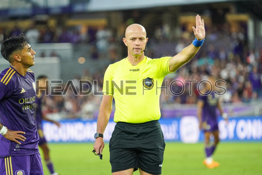 Orlando, Florida, USA, May 27, 2023, Game Ref Allen Chapman gestures during a call for penalty in the first half at Exploria Stadium. (Photo Credit: Marty Jean-Louis)