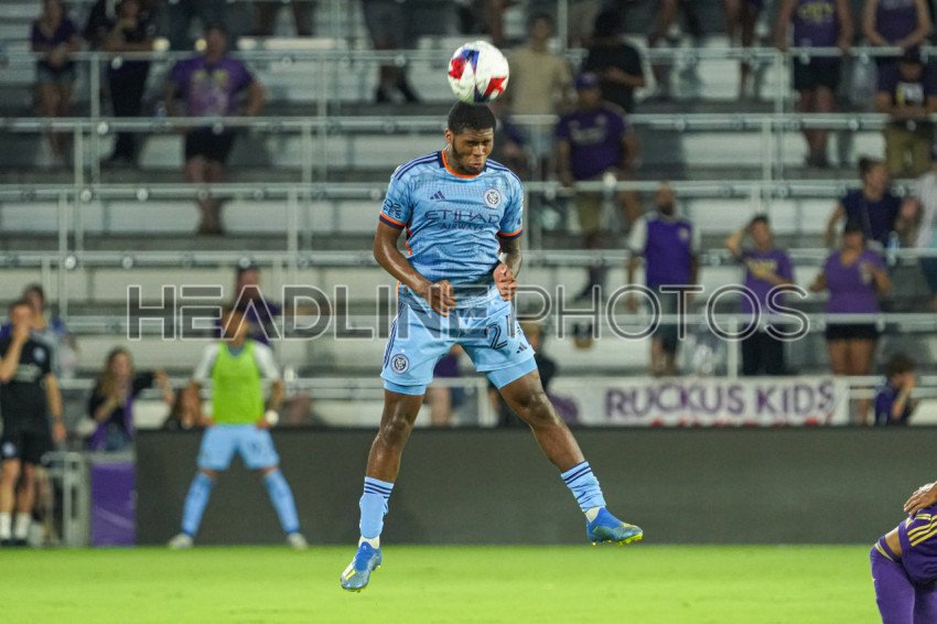 Orlando, Florida, USA, May 17, 2023, New York City FC player Tayvon Gray #24 makes a header in the first half at Exploria Stadium. (Photo Credit: Marty Jean-Louis)