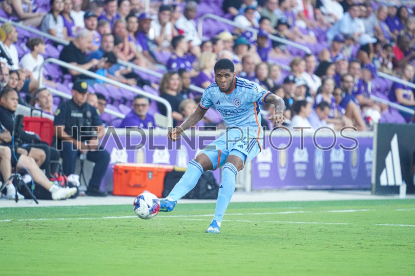 Orlando, Florida, USA, May 17, 2023, New York City FC player Tayvon Gray #24 makes a pass in the first half at Exploria Stadium. (Photo Credit: Marty Jean-Louis)