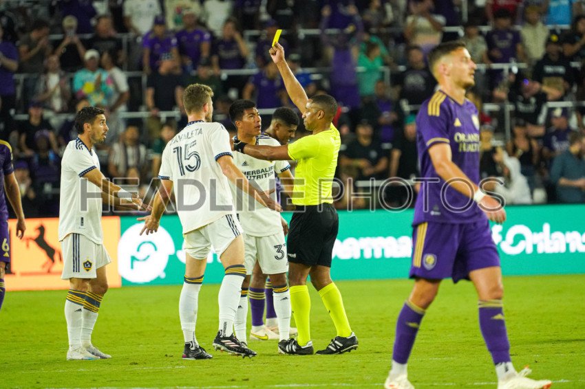 Orlando, Florida, USA, April 29, 2023, LA Galaxy player receives a yellow card at Exploria Stadium. (Photo Credit: Marty Jean-Louis)
