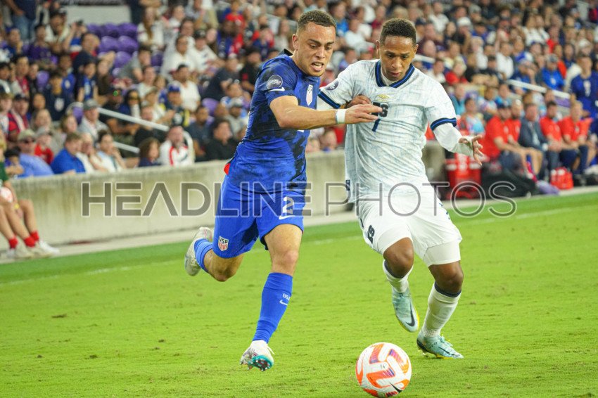 Orlando, Florida, March 27, 2023, El Salvador player and USA player Sergino Dest #2 fight for teh ball during the CONCACAF Nations League Match at Exploria Stadium. (Photo Credit: Marty Jean-Louis)