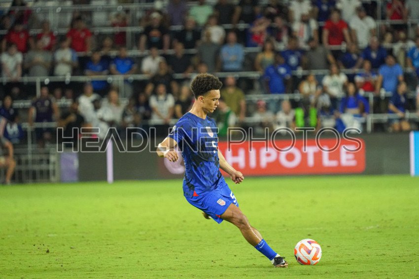 Orlando, Florida, March 27, 2023, USA defender Antonee Robinson #5 makes a pass during the CONCACAF Nations League Match at Exploria Stadium. (Photo Credit: Marty Jean-Louis)