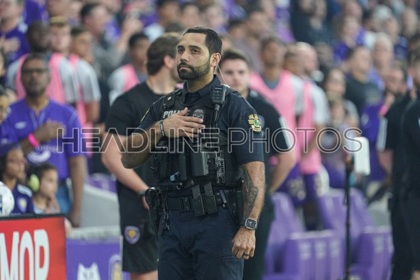 Orlando, Florida, USA, April 1, 2023, Orlando Police Officer during the National Anthem at Exploria Stadium (Photo Credit: Marty Jean-Louis)