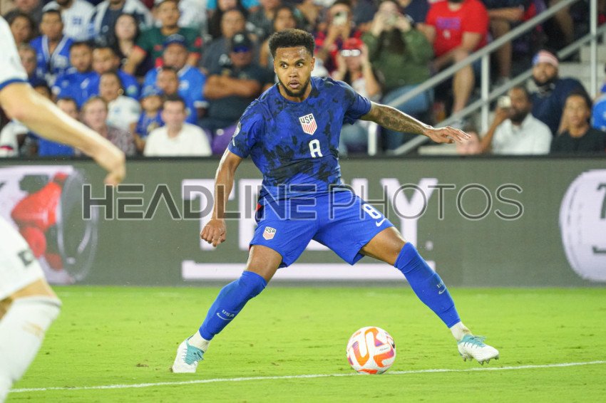Orlando, Florida, March 27, 2023, USA Midfielder Weston Mckennie #8 controls the ball during the CONCACAF Nations League Match at Exploria Stadium. (Photo Credit: Marty Jean-Louis)