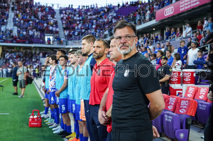 Orlando, Florida, March 27, 2023, El Salvador and USA players and coaching staff line up for the National Anthems during the CONCACAF Nations League Match at Exploria Stadium. (Photo Credit: Marty Jean-Louis)