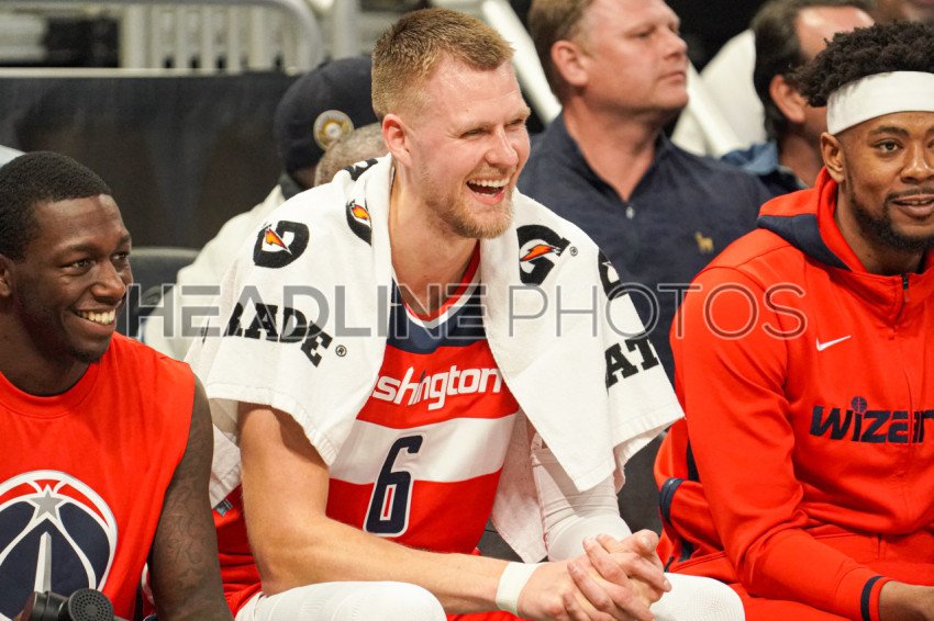 Orlando, Florida, USA, March 21, 2023, Washington Wizards center Kristaps Porzingis #6 laughing with team mates while on the bench during the first half at the Amway Center. (Photo Credit: Marty Jean-Louis)