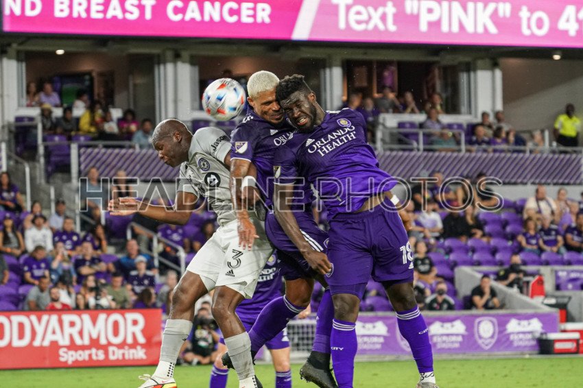 Orlando, Florida, USA, October 20, 2021, Orlando City SC forward Daryl Dike #18 and Midfielder Junior Urso #11 attempt to score as Kamal Harris #3 defends the ball during the second half at Exploria Stadium. (Photo Credit: Marty Jean-Louis)