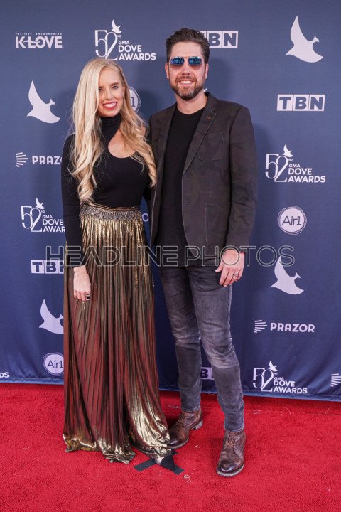 Nashville, Tennessee, USA, October 21, 2021. Christian Artist Corey Crowder and his wife walk the Red Carpet during the 52nd Annual GMA Dove Awards at Allen Arena.