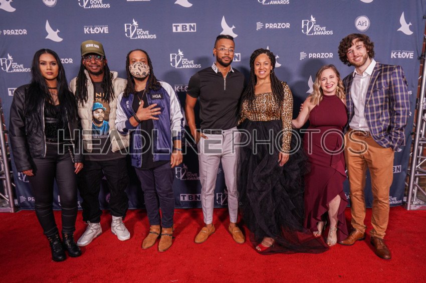 Nashville, Tennessee, USA, October 19, 2021. Group KB and the producers walk the Red Carpet during the 52nd Annual GMA Dove Awards at Allen Arena.