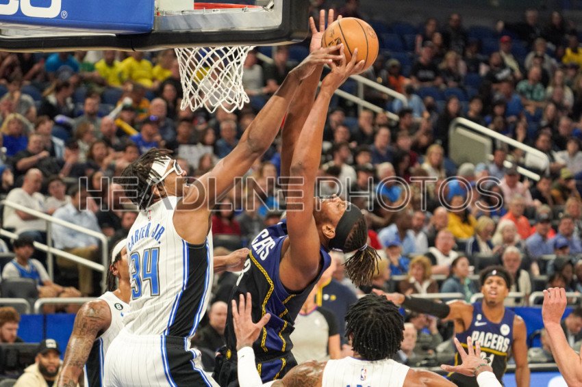 Orlando, Florida, USA, January 25, 2023, Indiana Pacers center Myles Turner #33 attempt to make a basket but is blocked by Wendell Carter Jr #34 at the Amway Center. (Photo Credit: Marty Jean-Louis)