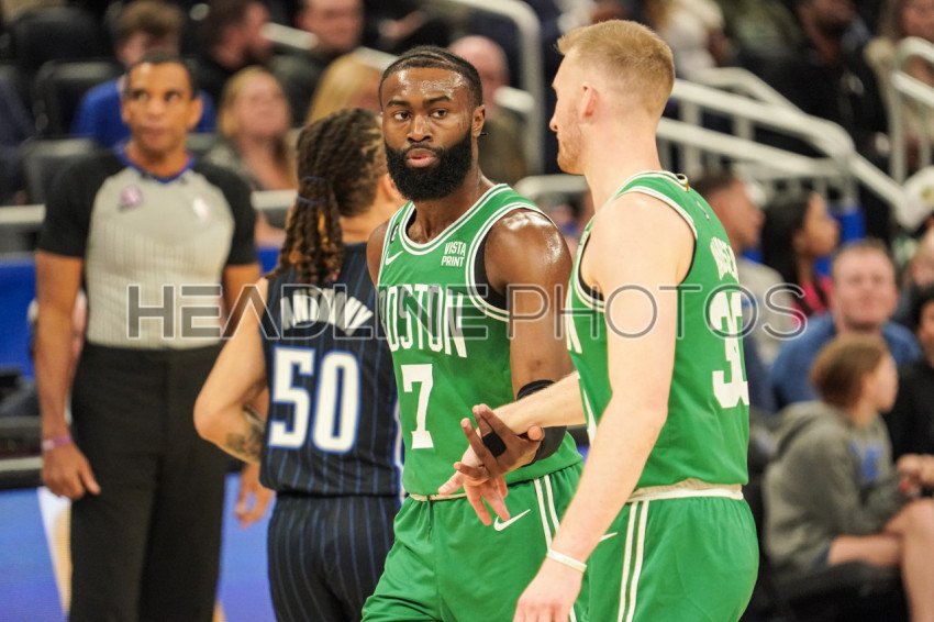 Orlando, Florida, USA, January 23, 2023, Boston Celtics players Jaylen Brown #7 and Sam Hauser #30 heads to the bench at the end of the first quarter at the Amway Center. (Photo Credit: Marty Jean-Louis)