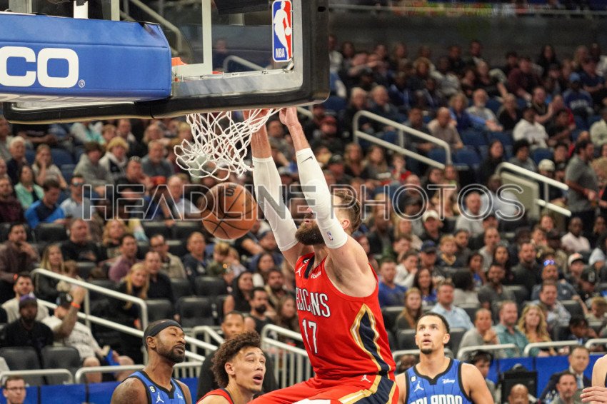 Orlando, Florida, USA, January 20, 2023, New Orleans Pelicans center Jonas Valanciunas #17 makes a dunk in the second half at the Amway Center. (Photo Credit: Marty Jean-Louis)