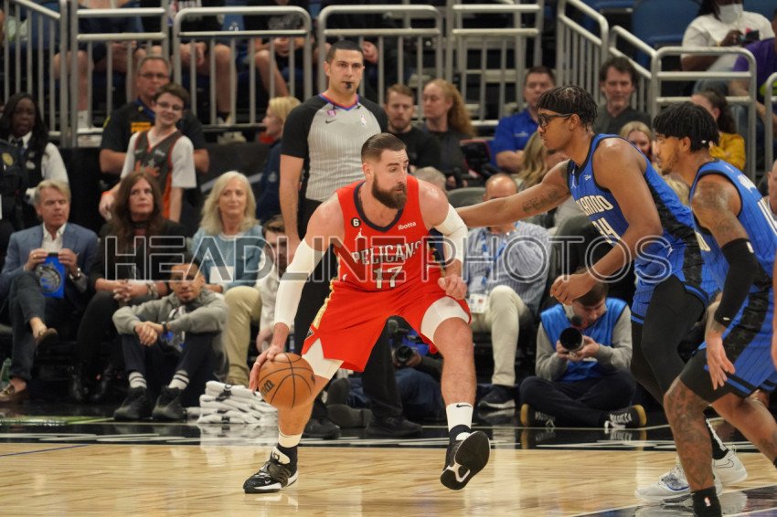 Orlando, Florida, USA, January 20, 2023, New Orleans Pelicans center Jonas Valanciunas #17 pushes his way forward during the first half at the Amway Center. (Photo Credit: Marty Jean-Louis)