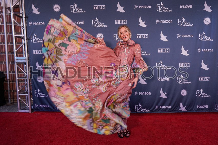 Nashville, Tennessee, USA, October 19, 2021. Christian Singer, Songwriter Lauren Daigle having some fun on the Red Carpet during the 52nd Annual GMA Dove Awards at Allen Arena.