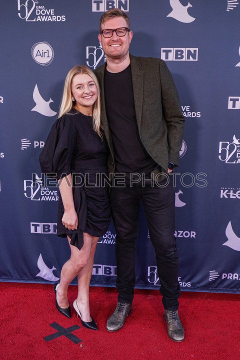 Nashville, Tennessee, USA, October 19, 2021. Jeff Sojka and his wife walk the Red Carpet during the 52nd Annual GMA Dove Awards at Allen Arena.