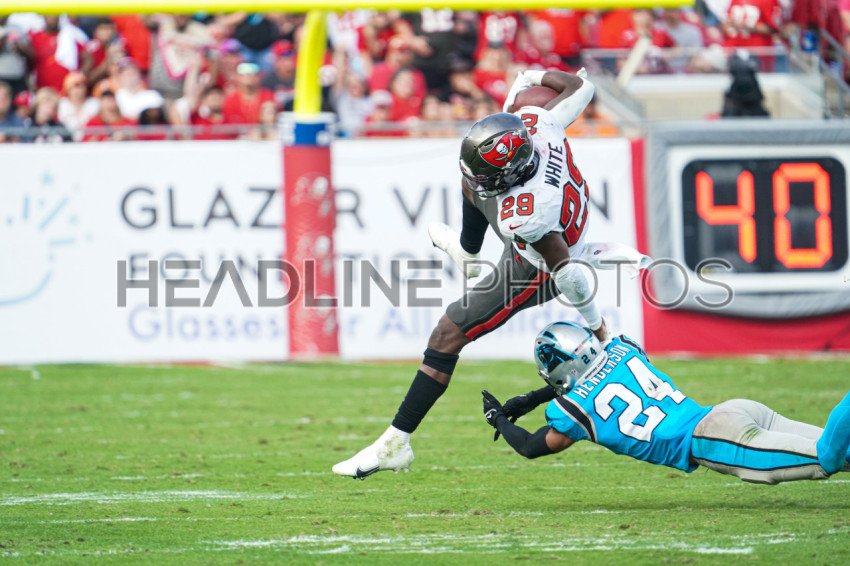 Tampa Bay, Florida, USA, January 1, 2023, Tampa Bay Buccaneers player Rachaad White #29 jumps to avoid tackle in the fourth quarter at Raymond James Stadium. (Photo Credit: Marty Jean-Louis)