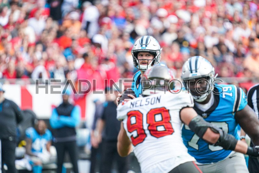 Tampa Bay, Florida, USA, January 1, 2023, Carolina Panthers quaterback Sam Darnold #14 looks to make a pass during the fourth quarter at Raymond James Stadium. (Photo Credit: Marty Jean-Louis)