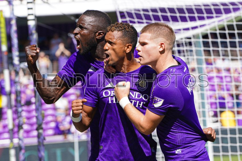 (L to R) Lamine Sane (22) Nani (17) and Chris Mueler (9) celebrates goal at Orlando City Statium on May 19, 2019. Photo Credit: Marty Jean-Louis