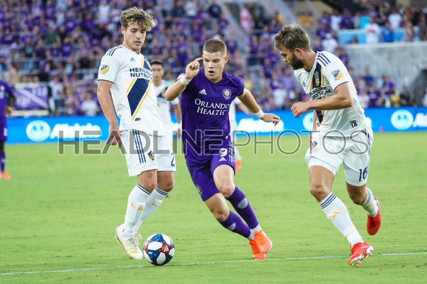 Orlando City's C Muller (9) breaks pass through LA Galaxy defenders. At the Orlando City Stadium on Friday May 24, 2019 in Orlando, Florida. Photo Credit: Marty Jean-Louis