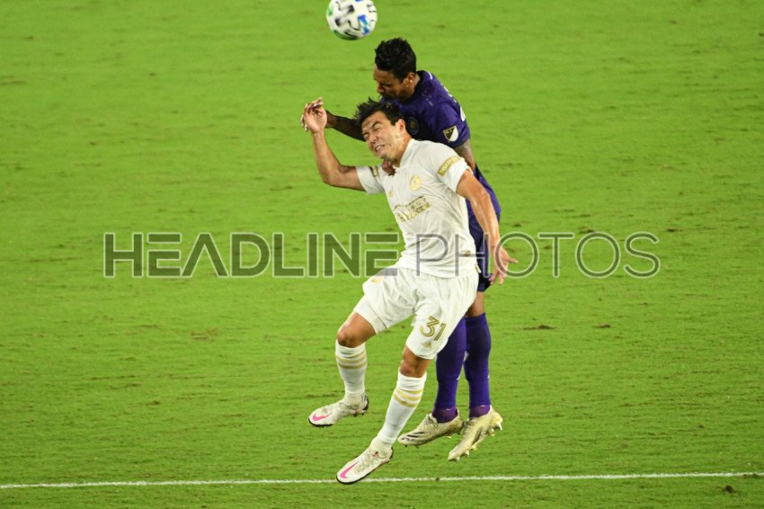 Atlanta United and Orlando City players fight for the header at Exploria Stadium in Orlando Florida USA on Wednesday October 28, 2020. Photo Credit: Marty Jean-Louis