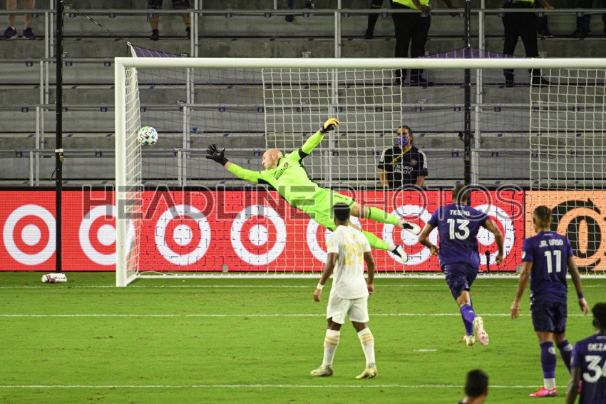 Atlanta United player Brad Guzan #1 misses the kick ball by Orlando City's Chris Mueller #9 at Exploria Stadium in Orlando Florida USA on Wednesday October 28, 2020. Photo Credit: Marty Jean-Louis