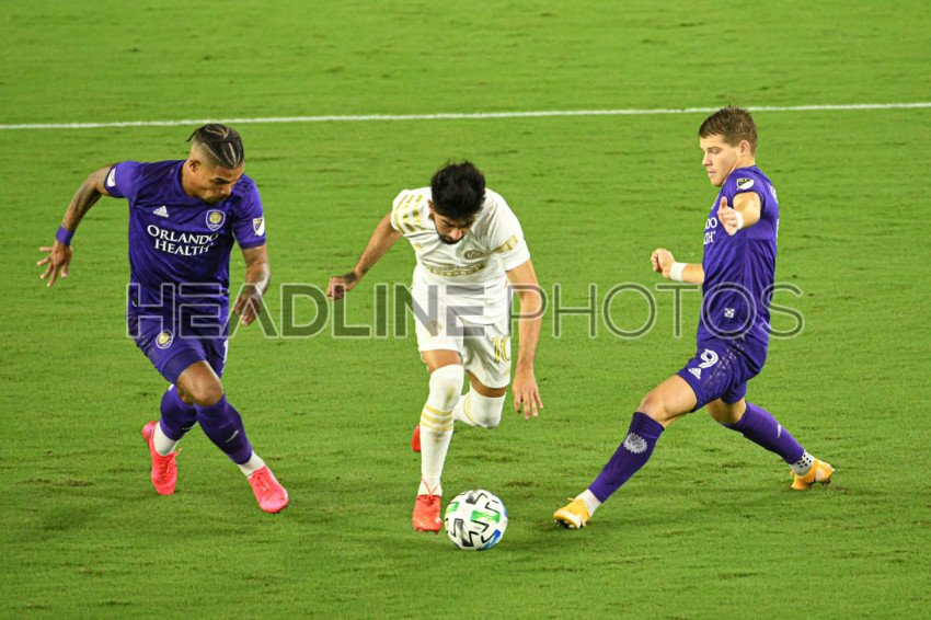 Atlanta United midfielder Marcelino Moreno #10 attempt to run pass Orlando City players Junio Urso #11 and Chris Mueller #9 at Exploria Stadium in Orlando Florida USA on Wednesday October 28, 2020. Photo Credit: Marty Jean-Louis