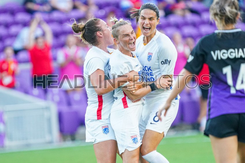 Orlando, Florida, USA, July 24, 2021, OL Reign players celebrate after scoring against the Orlando Pride at Exploria Stadium. (Photo Credit: Marty Jean-Louis)