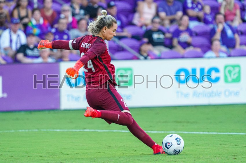 Orlando, Florida, USA, July 24, 2021, Orlando Pride Goalkeeper Ashlyn Harris #24 makes a kick at Exploria Stadium. (Photo Credit: Marty Jean-Louis)