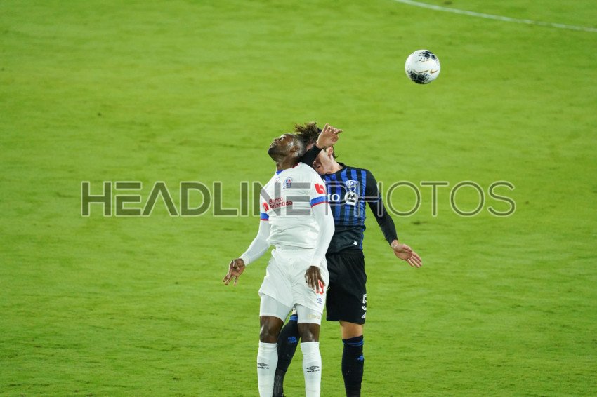 Orlando, Florida, USA, December 15, 2020, CD Olimpia andMontreal Impact players fight for the header dudring the CONCACAF Quarter Final Match (Photo Credit: Marty Jean-Louis)