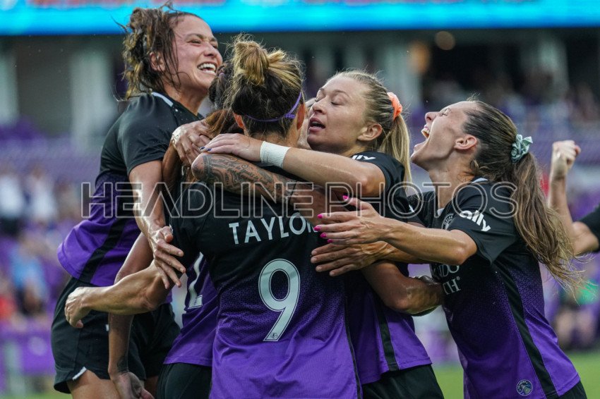 Orlando, Florida, USA, August 14, 2021, Orlando Pride players celebrate after scoring in the first half against the Portland Thorns at Exploria Stadium. (Photo Credit: Marty Jean-Louis)