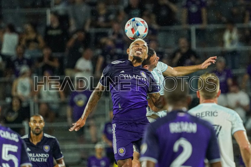 Orlando, Florida, USA, August 21, 2021, Orlando City SC player Junior Urso #11 wins the header at Exploria Stadium. (Photo Credit: Marty Jean-Louis)