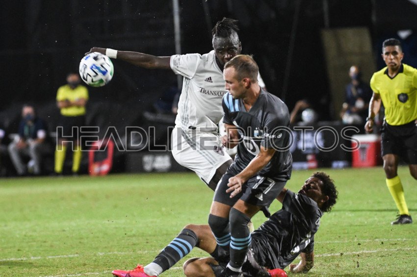 Colorado Rapids and Minnesota United players fight for the ball during the MLS is Back Tournament at ESPN Wild World of Sport in Orlando Florida USA on Tuesday July 22, 2020. Photo Credit: Marty Jean-Louis