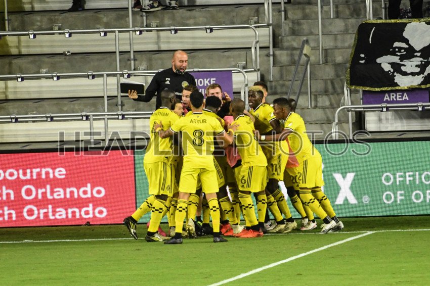 Columbus Crew players celebrate goal at Exploria Stadium in Orlando Florida on Wednesday November 4, 2020. Photo Credit: Marty Jean-Louis
