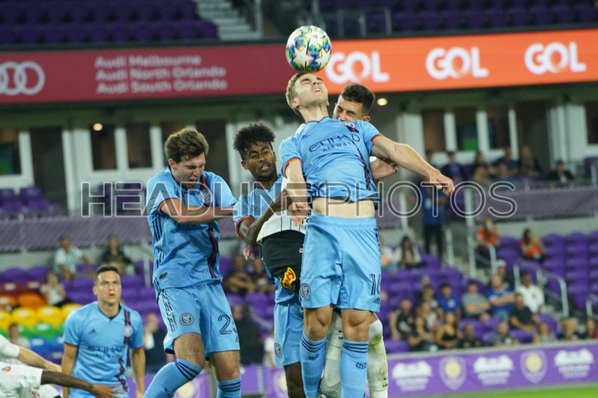 NYC FC Player James Sanos makes a header at Exploria Stadium in Orlando Florida on Wednesday January 15, 2020. Photo Credit: Marty Jean-Louis