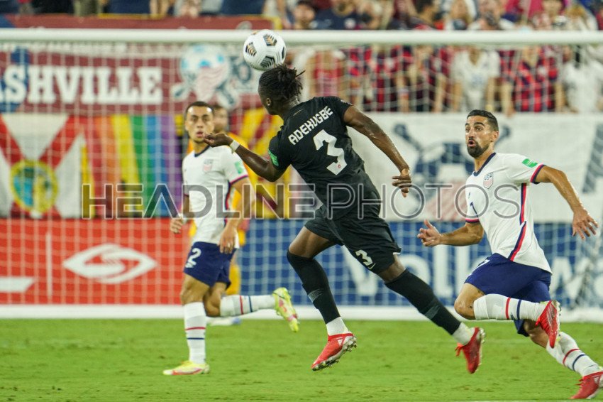 Nashville, Tennessee, USA, September 5, 2021, Canada player Samuel Ayomide Adekugbe #3 makes a header during the 2022 World Cup Qualifier at Nissan Stadium. (Photo Credit: Marty Jean-Louis)