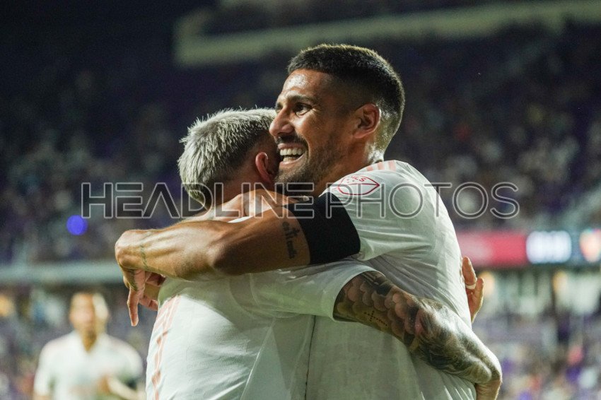 Orlando, Florida, USA, May 28, 2022, FC Dallas players Paul Ariola #7 (left) and Franco Jara #29 celebrate goal in the second half Orlando City SC at Exploria Stadium. (Photo Credit: Marty Jean-Louis)