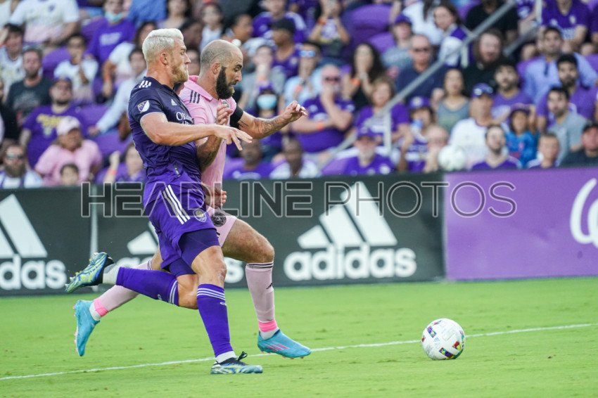 Orlando, Florida, USA, May 25, 2022, Inter Miami forward Gonzalo Higuain #10 and Orlando City SC defender Robin Jansson #6 fight for the ball in the first half at Exploria Stadium. (Photo Credit: Marty Jean-Louis)