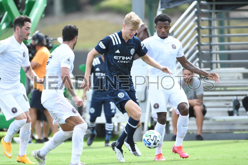 New York City FC midfielder Parks, Keaton #55 makes a run as Inter Miami CF defenders attempt to block during the MLS is Back Tournament at ESPN Wild World of Sports in Orlando Florida USA on Monday July 20, 2020. Photo Credit: Marty Jean-Louis