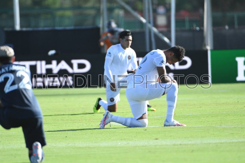 New York City FC and Miami CF players kneel in solidarity with the Black Lives Matter Movement during the MLS is Back Tournament at ESPN Wild World of Sports in Orlando Florida USA on Monday July 20, 2020. Photo Credit: Marty Jean-Louis