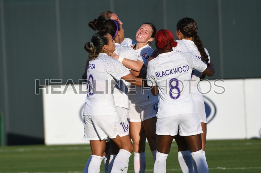 Orlando Pride players celebrate goal at Osceola County Stadium in Kissimmee Florida on Friday October 9, 2020. Photo Credit: Marty Jean-Louis