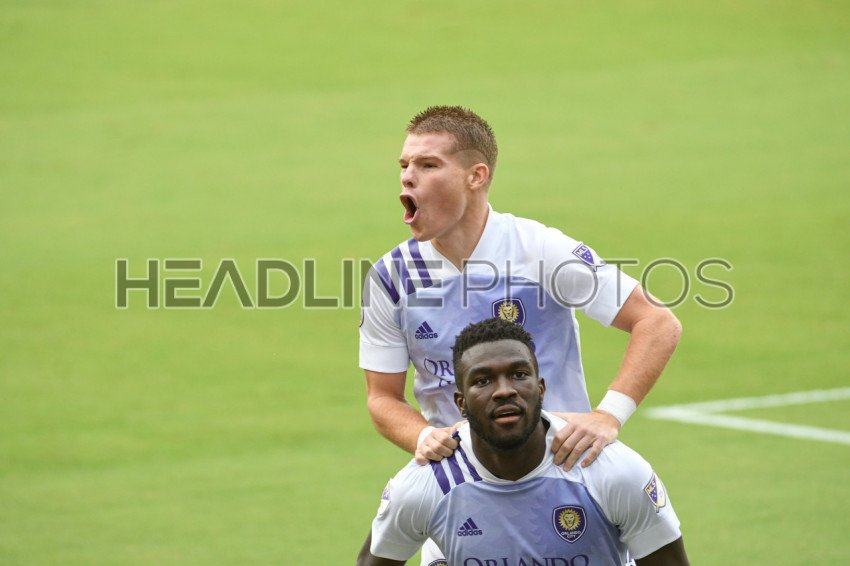 Orlando City SC players Dike #18 and Muller #9 celebrate goal at Exploria Stadium on Sunday November 8, 2020 in Orlando Florida USA. Photo Credit: Marty Jean-Louis