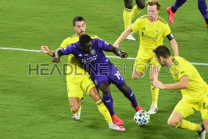 Orlando City SC attacker Benji Michel #19 is being defended by Nashville's defenders at Exploria Stadium in Orlando Florida on Wednesday August 26, 2020. Photo Credit: Marty Jean-Louis