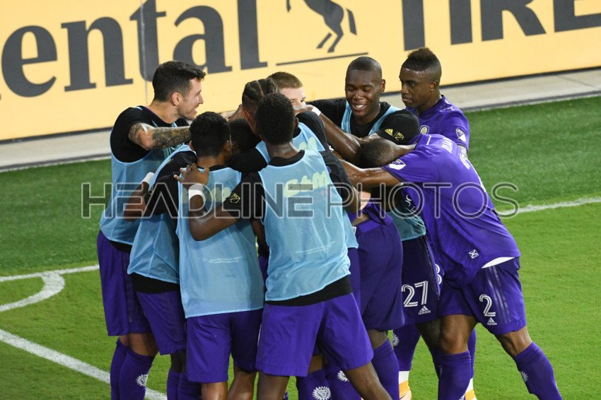 Orlando City SC players celebrate goal at Exploria Stadium in Orlando Florida on Wednesday August 26, 2020. Photo Credit: Marty Jean-Louis