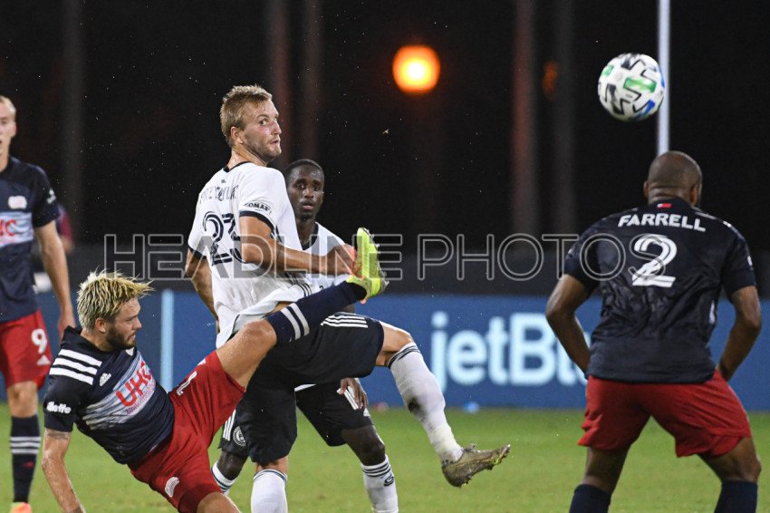 Philadelphia Union and New England Revolution players fight for the ball during the MLS is Back Tournament at ESPN Wild World of Sports in Orlando Florida on Saturday July 26, 2020. Photo Credit: Marty Jean-Louis