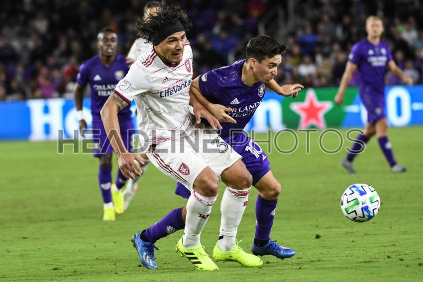 Orlando City SC player Mauricio Pereyra #10 and Real Salt Lake player Marcelo Silva #30 fight for the ball at Exploria Stadium on Saturday February 29, 2020. Photo Credit: Marty Jean-Louis