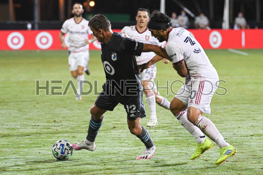 Minnesota United forward Martinez, Douglas #12 fight to keep the ball during the MLS is Back Tournament at ESPN Wild World of Sports in Orlando Florida on Friday July 17, 2020. Photo Credit: Marty Jean-Louis