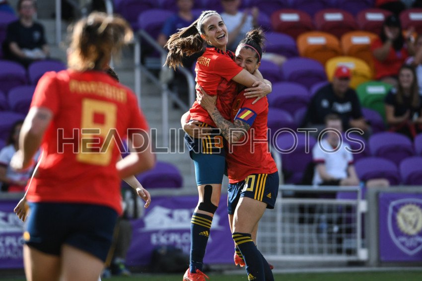 Spanish team members celebrate after goal against Japan during the 2020 SheBelieves Cup at Exploria Stadium in Orlando Florida on Thursday March 5, 2020. Photo Credit: Marty Jean-Louis