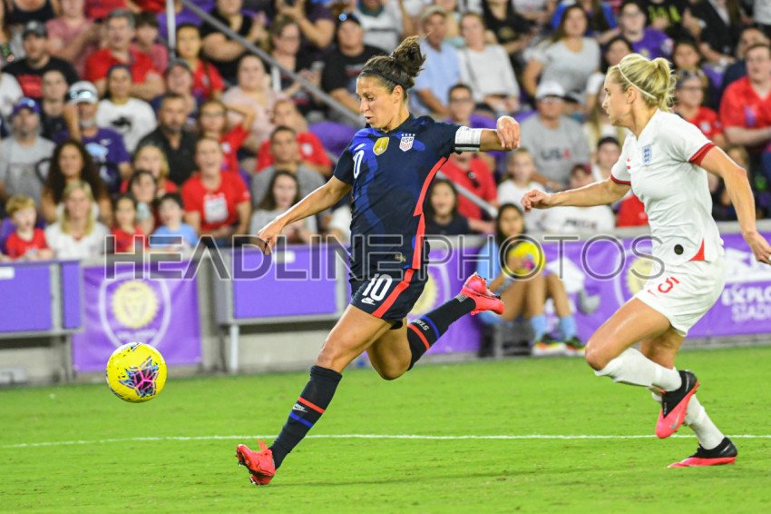 USWNT Player Carli Lloyd #10 takes a powerful shot during the 2020 SheBelieves Cup at Exploria Stadium in Orlando Florida on Thursday March 5, 2020. Photo Credit: Marty Jean-Louis