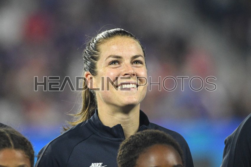 USWNT Player Kelley O'Hara smiles during the National Anthem, 2020 SheBelieves Cup at Exploria Stadium in Orlando Florida on Thursday March 5, 2020. Photo Credit: Marty Jean-Louis