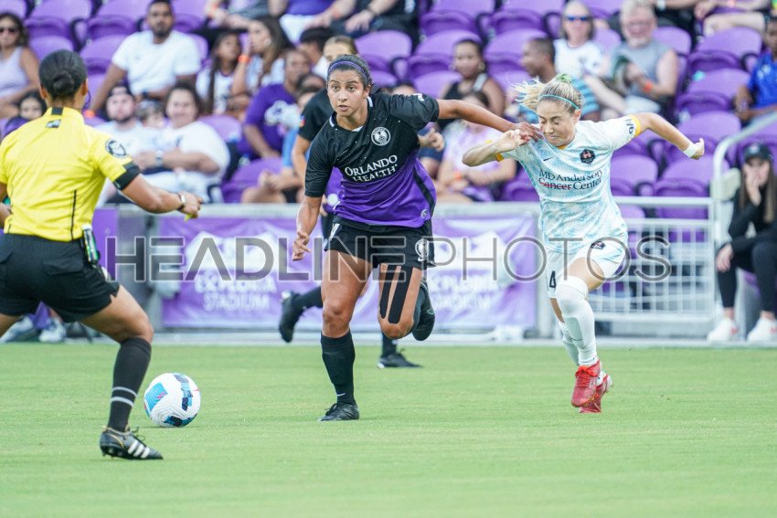 Orlando, Florida, USA, July 8, 2022, Houston Dash player Visalli Brianna #14 and Orlando Pride Villaocorta Vivianna #14 fight for the ball in the first half at Exploria Stadium. (Photo Credit: Marty Jean-Louis)